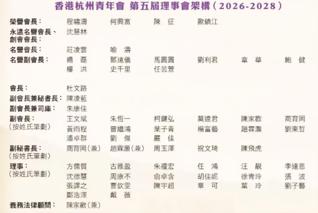 2026年3月3日晚,香港杭州青年會於沙田石門彩福皇宴隆重舉行2026年春茗暨會員大會,選舉產生第五屆理事會,杜文路當選為新一屆會長。晚會匯聚近200名政商界、社團領袖、香港杭州同鄉總會和區會代表、浙江省青年代表、理事及會員朋友,共同見證換屆盛事,展望未來發展藍圖。
